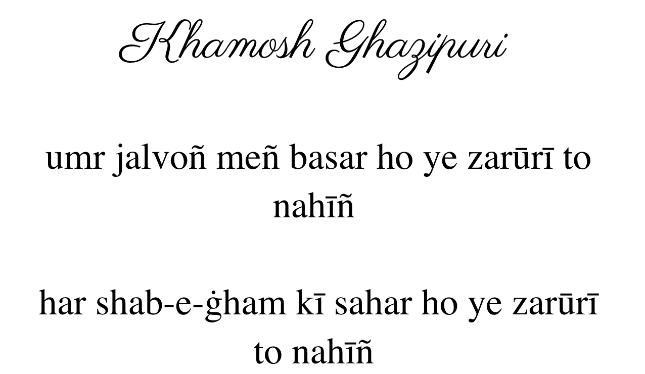 Muzaffar Hussain, Ghazipur UP. Short introduction: Pen Name :'Khamosh' Real Name : Muzaffar Hussain Born in : Ghazipur, Uttar pradesh Born on :20 Jul 1932 Died on :27 Sep 1981 Few of his Shairis: 1. niind to dard ke bistar pe bhi aa sakti hai un ke aaghosh meN sar ho ye zaruri to nahin 2. sab ki nazron meN ho saaqi ye zaroori hai magar sab pe saaqi ki nazar ho ye zaruri to nahin 3. sheikh karta to hai masjid meN ḳhuda ko sajde us ke sajdon meN asar ho ye zaruri to nahin Following is full Ghazal by Khamosh Ghazipuri: umr jalvoñ meñ basar ho ye zarūrī to nahīñ har shab-e-ġham kī sahar ho ye zarūrī to nahīñ chashm-e-sāqī se piyo yā lab-e-sāġhar se piyo be-ḳhudī āThoñ pahar ho ye zarūrī to nahīñ niiñd to dard ke bistar pe bhī aa saktī hai un kī āġhosh meñ sar ho ye zarūrī to nahīñ shaiḳh kartā to hai masjid meñ ḳhudā ko sajde us ke sajdoñ meñ asar ho ye zarūrī to nahīñ sab kī nazroñ meñ ho saaqī ye zarūrī hai magar sab pe saaqī kī nazar ho ye zarūrī to nahīñ mai-kashī ke liye ḳhāmosh bharī mahfil meñ sirf ḳhayyām kā ghar ho ye zarūrī to nahīñ Ghazipur is a land of few famous literary people. Rahi Massom Raza has been a luminory. It was a land where Sir Syed Ahmad Khan also worked. Aasi Ghazipuri is another name in poetry. Urmilesh, PN Singh are two big names in Hindi circles. In new generation Obaidurrahman in field of history and Anwar Jamal in the field of technology and literature are making the city proud. Above Ghazal in Hindi: उम्र जल्वों में बसर हो ये ज़रूरी तो नहीं हर शब-ए-ग़म की सहर हो ये ज़रूरी तो नहीं चश्म-ए-साक़ी से पियो या लब-ए-साग़र से पियो बेख़ुदी आठों पहर हो ये ज़रूरी तो नहीं नींद तो दर्द के बिस्तर पे भी आ सकती है उनकी आग़ोश में सर हो ये ज़रूरी तो नहीं शैख़ करता तो है मस्जिद में ख़ुदा को सज्दे उसके सज्दों में असर हो ये ज़रूरी तो नहीं सबकी नज़रों में हो साक़ी ये ज़रूरी है मगर सब पे साक़ी की नज़र हो ये ज़रूरी तो नहीं Another Ghazal: Dair-o-haram me.n basane vaalo , maiKhvaaro.n me.n phuuT na Daalo, tuufaan se ham Takraaye.nge, tum apnii kashtii ko sambhaalo , maikhaane me.n aaye vaa_iz, in ko bhii i.nsaa.N banaa lo, aariz-o-lab saadaa rahne do, taaj mahal pe rang na Daalo.